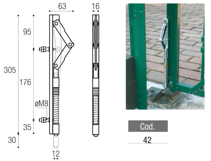 The toggle bolt cod. 42 Brevetti Adem is a resistant vertical toggle bolt, made of galvanized iron with adjustable spring and suitable for swing gates.
