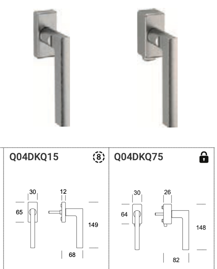 Stainless steel window handle Atene Reguitti DK 8 clicks version with or without button.