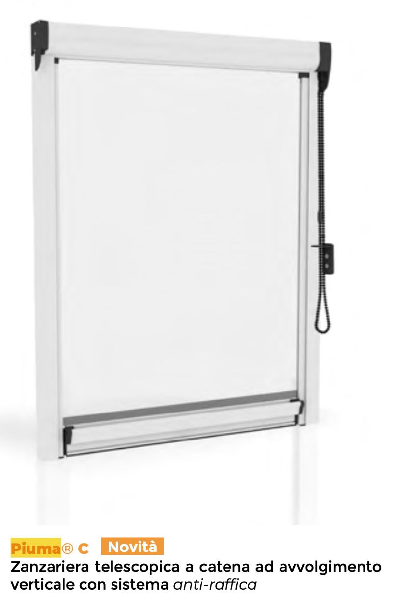 The Piuma C Effezeta System chain insect screen is a telescopic model with chain and vertical winding made with a special anti-burst system .