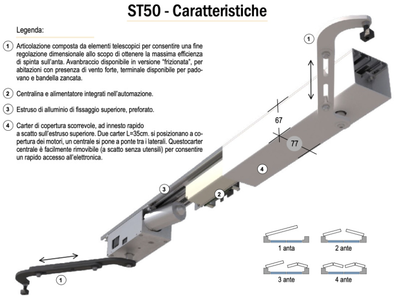 1. Articulation composed of telescopic elements to allow a fine dimensional adjustment in order to obtain the maximum thrust efficiency on the leaf. Forearm available in “frictioned” version, for homes with strong winds, terminal available for Paduan and zancata strip;