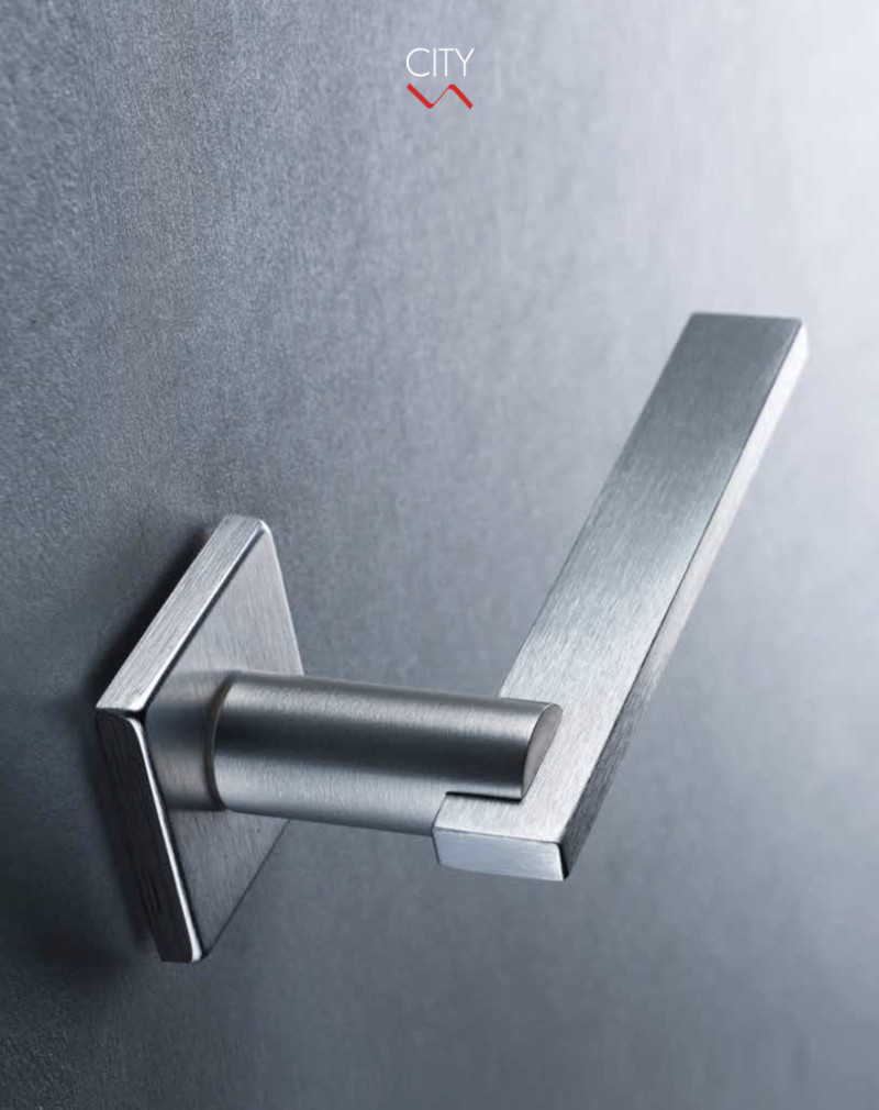 The City Arieni handle stands out for its geometric and modern lines, enriched by a combination of finishes that give it a distinctive look. The rectangular handle integrates perfectly with the square rosette, creating a balanced and harmonious design that adapts to contemporary and sophisticated interiors.