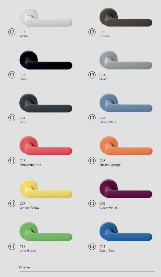 • Available finishes: 12 color variations (C01 White, C02 Bronze, C03 Black, C04 Silver, C05 Titan, C06 Ocean Blue, C07 Strawberry Red, C08 Sunset Orange, C09 Lemon Yellow, C10 Claret Violet, C11 Lime Green, C12 Capri Blue);