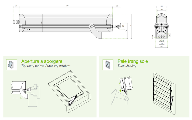 Comunello Raywin R20 24V electric rod actuator for opening and closing top-hung windows, slatted windows, sunshades and domes.