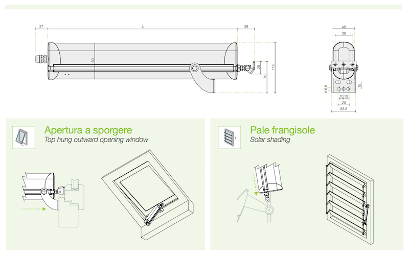 Package contents: rod type actuator provided with electric supply cable, anchor bracket and adjusting screws, fixing bracket for top-hung windows and domes and multi-lingual user’s guide.