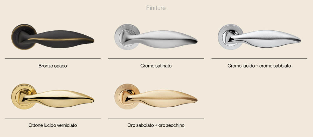 Made entirely of brass and carefully handcrafted in the Brescia district, the Delfino Cremonese handle is available in a range of fine finishes—matte bronze, satin chrome, polished chrome + sandblasted, painted polished brass, and sandblasted gold + pure gold—to elegantly adapt to both modern and more classic interiors.