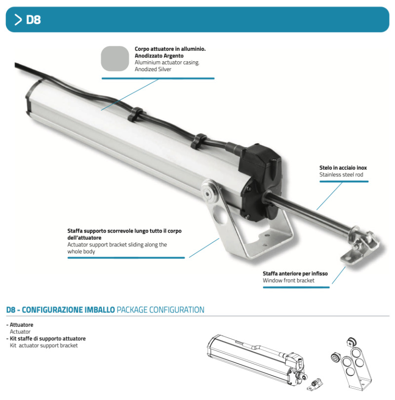 D8 Fce Mingardi, rod actuator for top hinged windows, domes, sunshade blades, louvred windows.