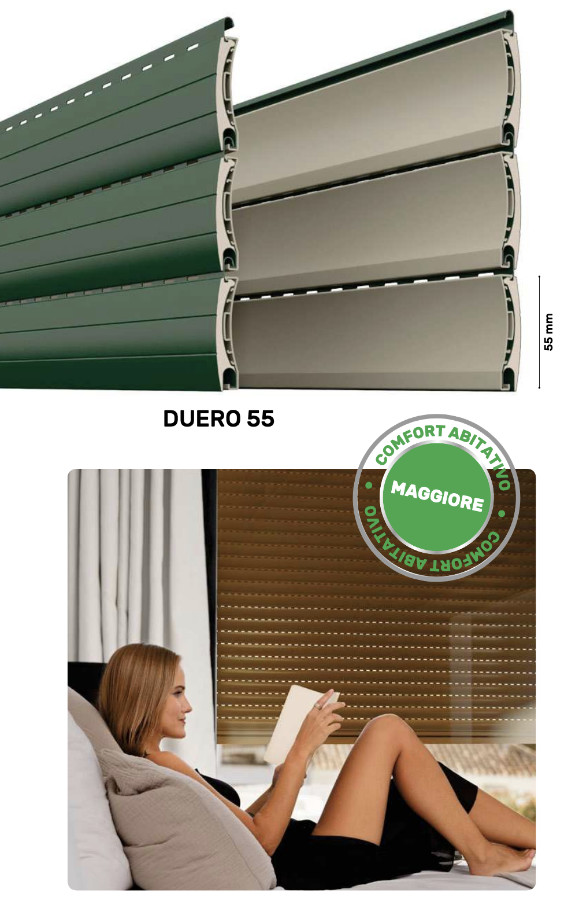 Duero55 is made up of an aluminum roller shutter profile with interposition of polyurethane foam coupled by interlocking with a self-extinguishing PVC profile. The central gap between the two materials creates a hive air chamber.
