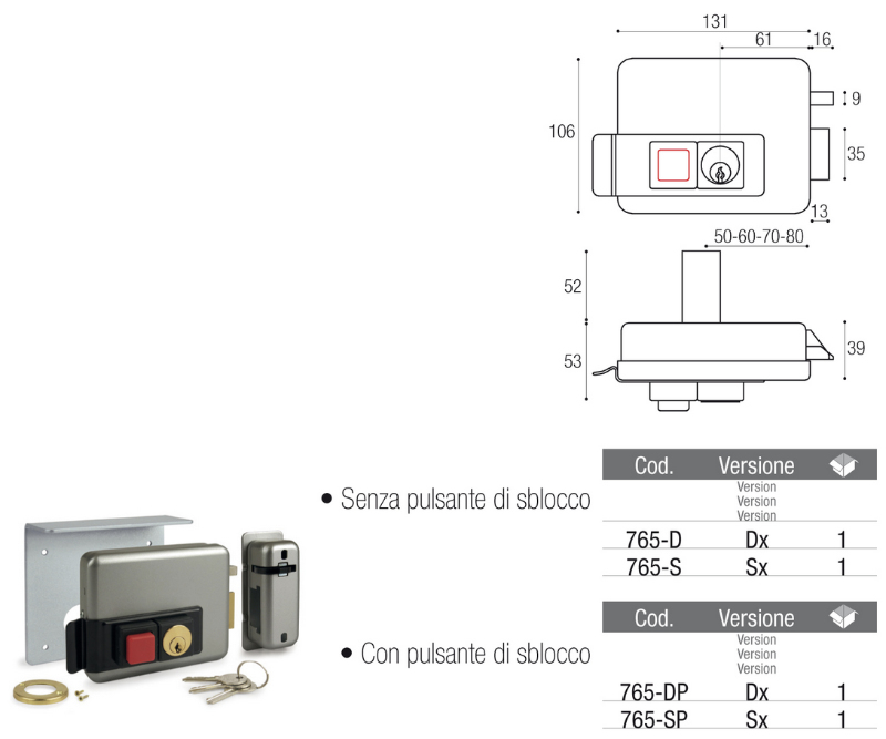 Electric lock for swing gate with release button (or without, if you select the variant), code 765 Adem.