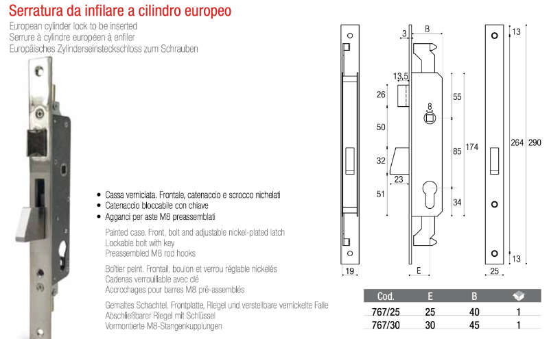 European cylinder mortise lock, code 767 Adem, is designed to guarantee safety and reliability.