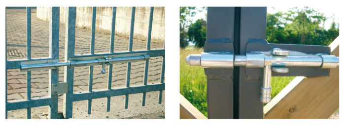 Bolt for gate, horizontal and with striker for safety and protection from intrusions. Outdoor applications.