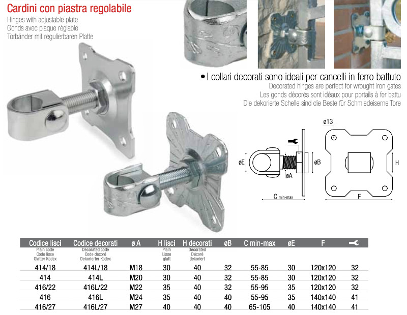 Cardine per Cancello con Piastra Regolabile e Collare Liscio o Decorato