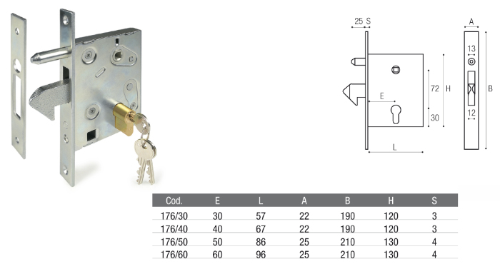 Discover the technical drawing and the measurements of the 176 Adem hook lock with entry of your choice.