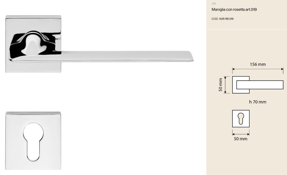 Dimensions: handle length 156 mm, rosette 50x50 mm;