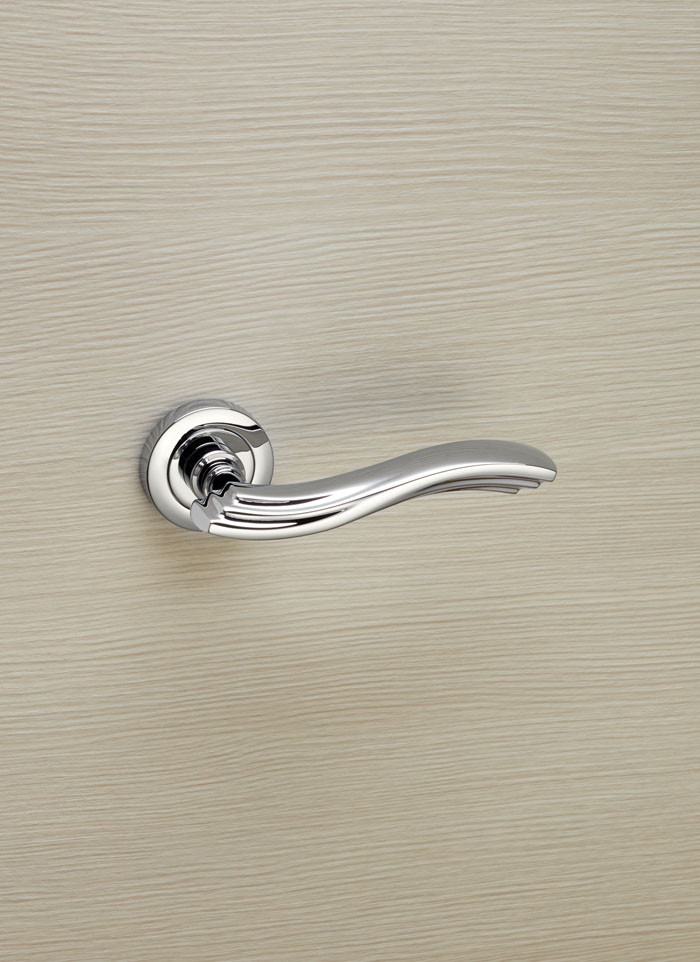 Soft lines, zero sharp edges: ideal even for homes with children. Perfect on classic wooden doors and, in chrome finishes, on modern laminate doors. The handle neck continues the layering theme, accompanying the movement towards the round rosette with an elegant and fluid visual effect.
