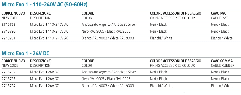 Cable: 110-240V AC: Black or White PVC / 24V DC: Black or White RUBBER - L.1500;