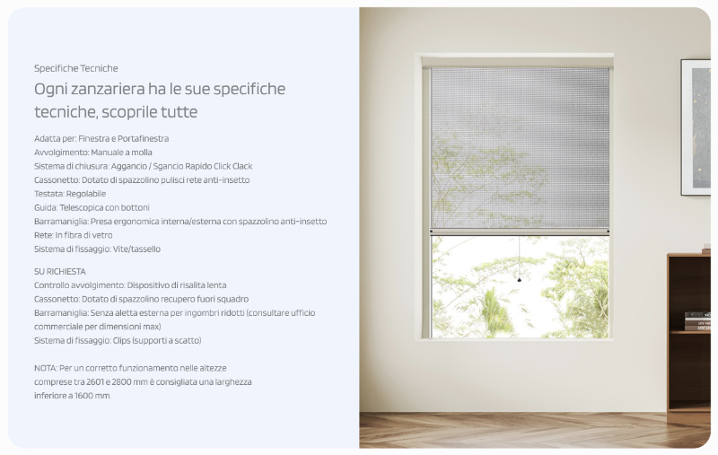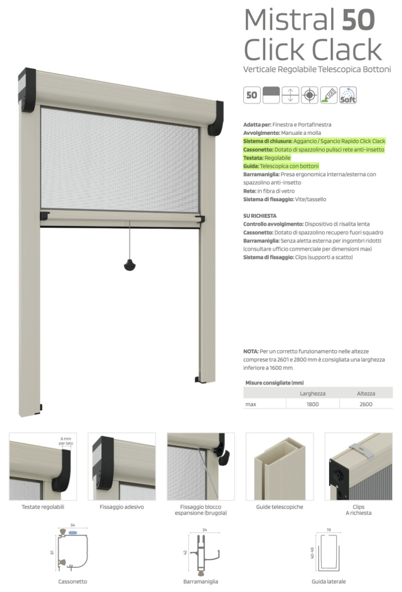 This vertical model, called Mistral 50 Click Clack, is characterized by an adjustable and telescopic design, which makes it adaptable to different sizes and types of openings. Practicality of use is ensured by the manual spring winding system, which allows simple and immediate management of the product.