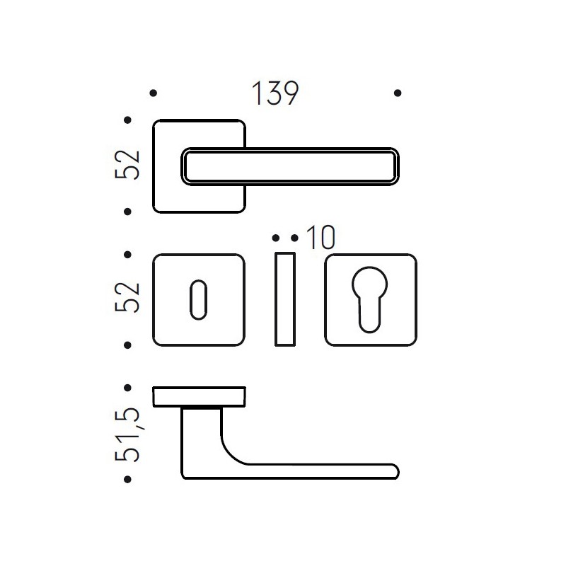 • Dimensions: length 139 mm – rosette 52x52 mm – thickness 10 mm.