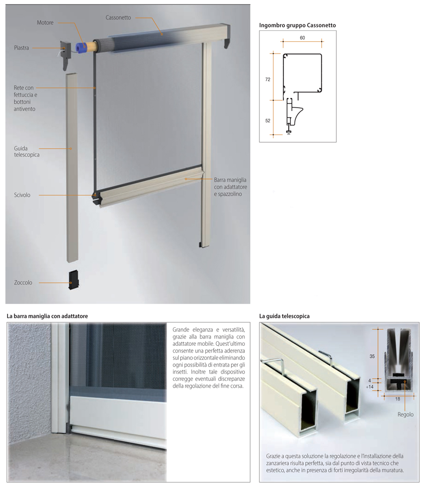 Thanks to this double guide, the adjustment and the installation of the mosquito net are both perfect, both from a technical and aesthetic point of view, also in presence of strong irregularities of the masonry.