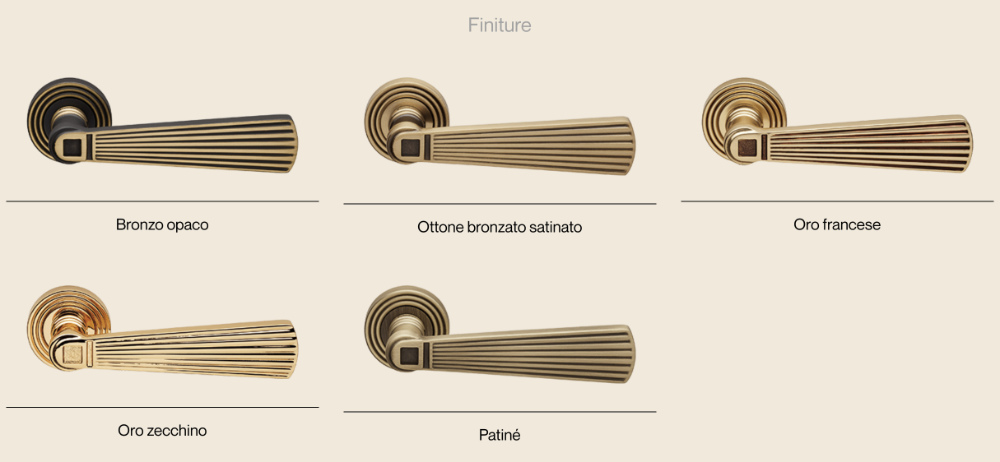 Available in five premium finishes – matt bronze, satin bronze brass, French gold, pure gold, and patiné – it offers a wide aesthetic versatility that adapts to any type of door and furnishing style.