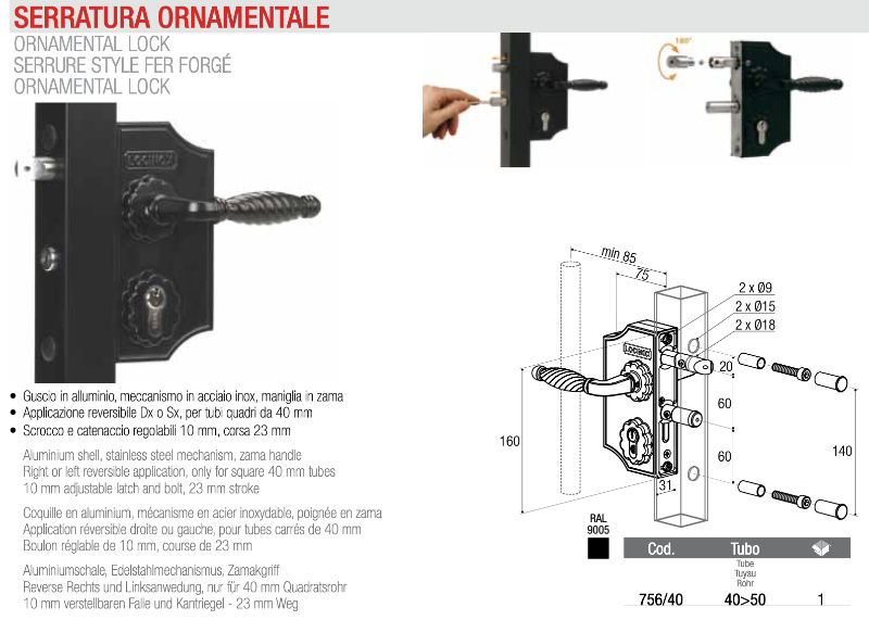 The lock application is reversible, adapting to both the right and left side of the gate and is ideal for 40mm square tubes. The latch and deadbolt are adjustable up to 10 mm with a travel of 23 mm, allowing precise locking and reliable closure.