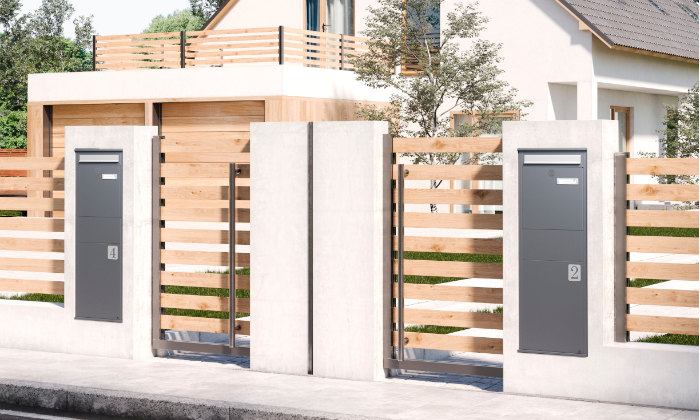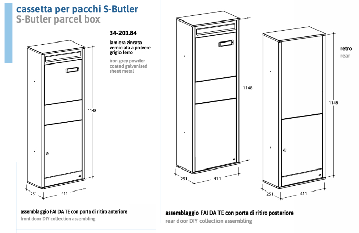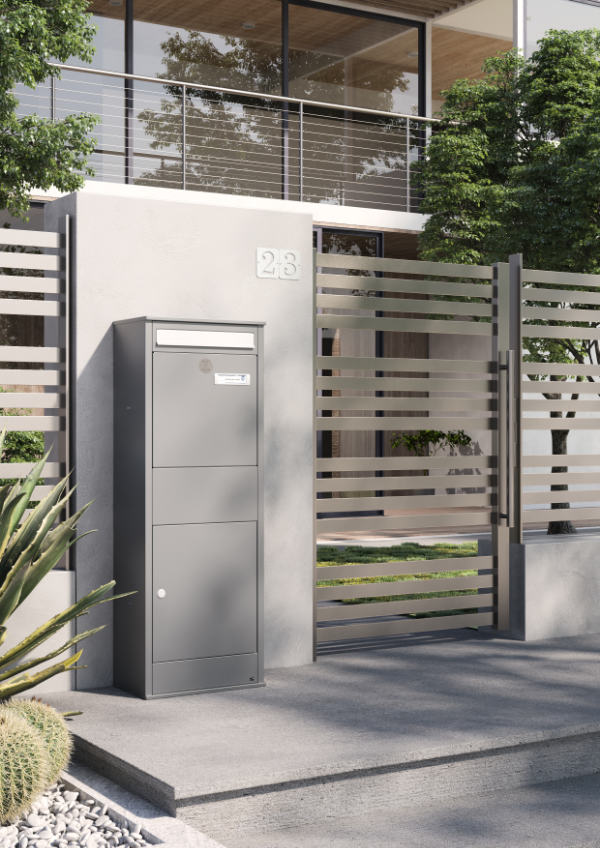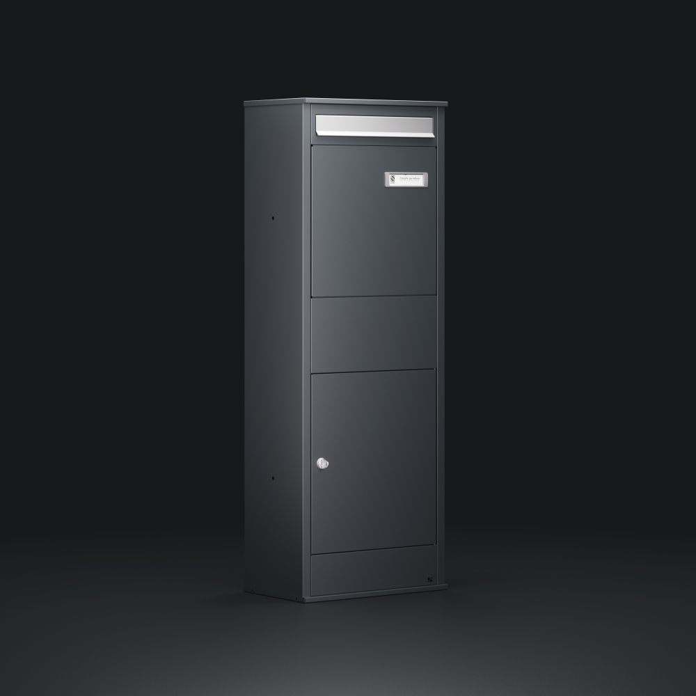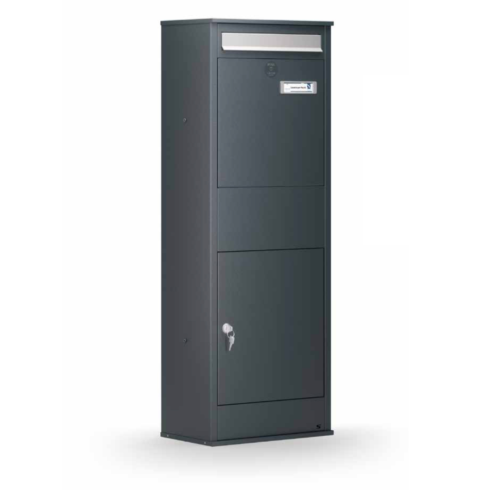 S-Butler parcel and postal box made entirely of iron gray powder coated galvanized sheet metal .
