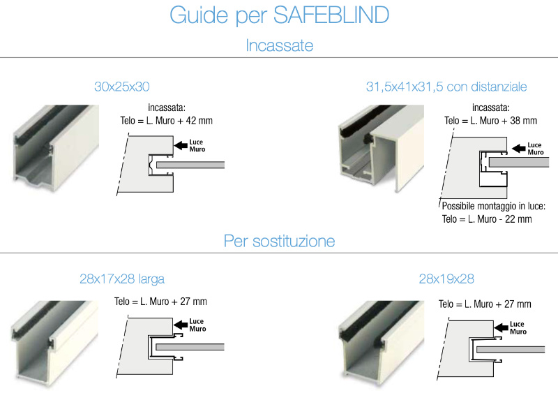 To obtain the SAFEBLIND certification it must always be installed with the anti-lifting safety systems, our SecurBlocks and the recessed guides. It can also be installed on traditional guides (for replacement) using the appropriate gasket.