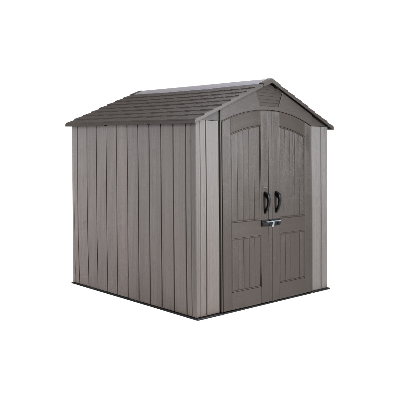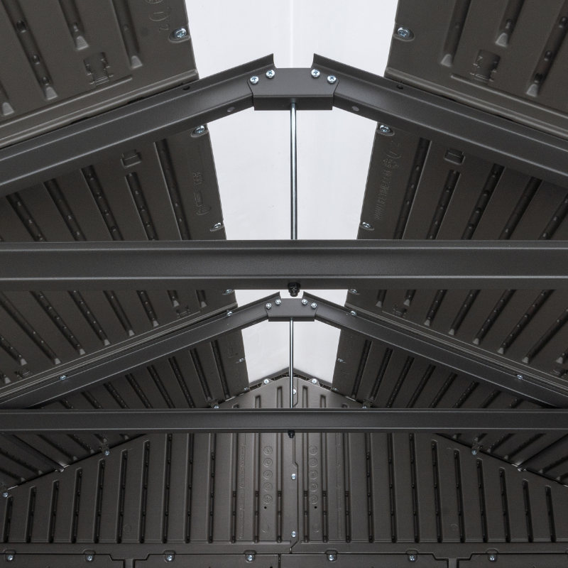 This shed is made of double walled high density polyethylene (HDPE). The color of the house is gray with wood effect grain, rough brushed finish. The roof is made with steel trusses and features a full-length skylight. The door is reinforced with steel components, locking with bolt.