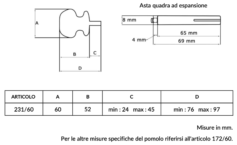 The Saguatti 231/60 door knob is made of anodized aluminum and has a flat head. It has a steel expansion square with dimensions of 8×65 mm and a diameter of 60 mm.