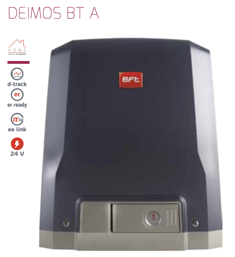 Bft DEIMOS BT KIT A600 ITA 24 V for automatic sliding gates up to 600 kg in weight. Leaf speed 12 m / min. Electromechanical limit switch. Central unit with Trimmer and dip switch.