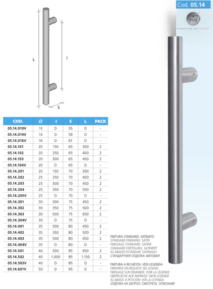 handle in satin, polished or painted stainless steel of AISI 316L or AISI 304 quality (select the variant), brand MPM code 05.14.