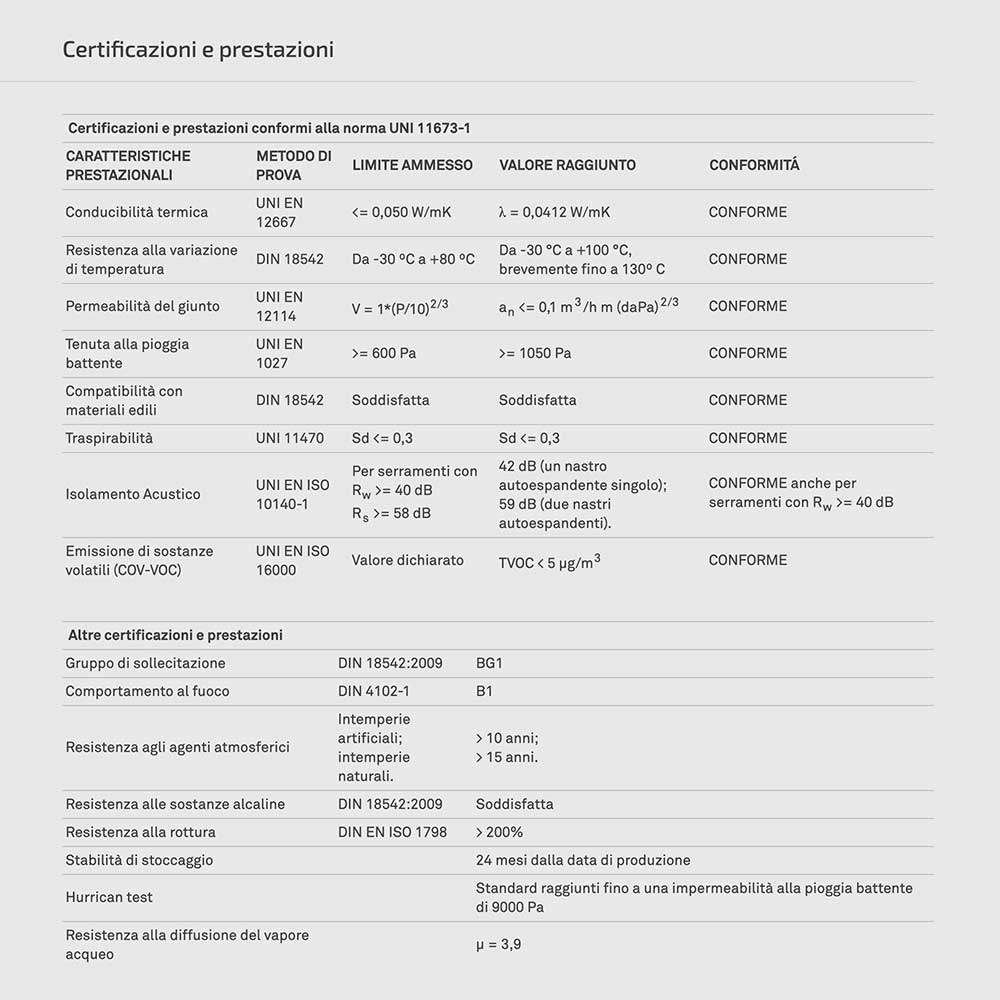 • Acoustic insulation (UNI EN ISO 10140-1): 42 dB (a single self-expanding tape) - 59 dB (two self-expanding tapes)