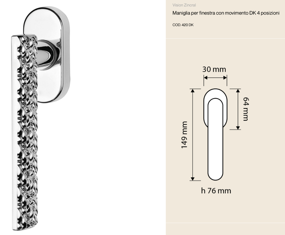 Made from high-quality Zincral in Italy, the Vision Zincral window handle harmoniously combines aesthetics and functionality. The three-dimensional texture not only enhances the style but also provides a comfortable and secure grip.