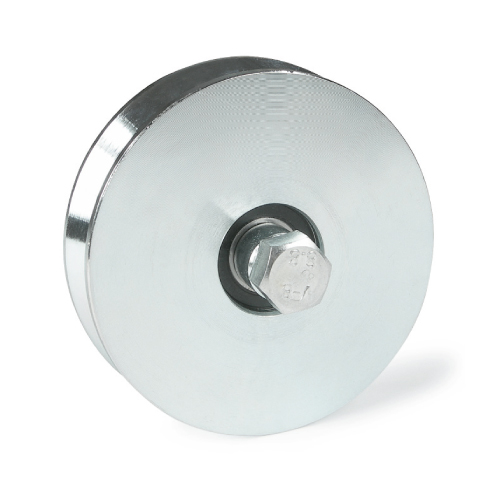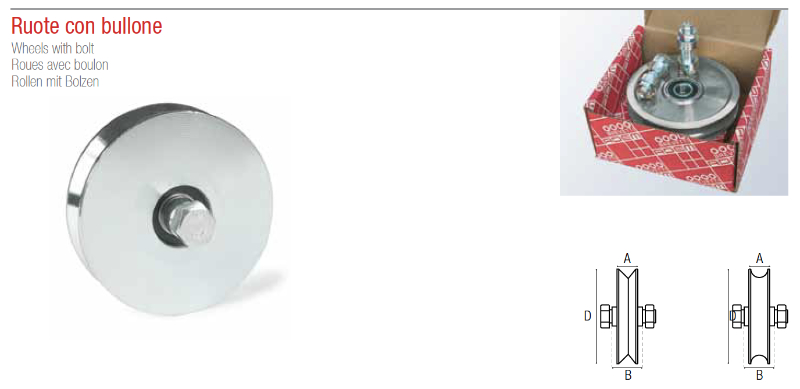 Wheel with bolt for sliding gate, made in various diameters by the company Brevetti Adem. V or U groove wheel, available with bolt. The capacity of the gate wheel varies according to the code.
