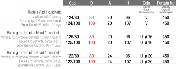 Wheel sizes with Adem external support (diameter, tube, groove, capacity kg and bolt):